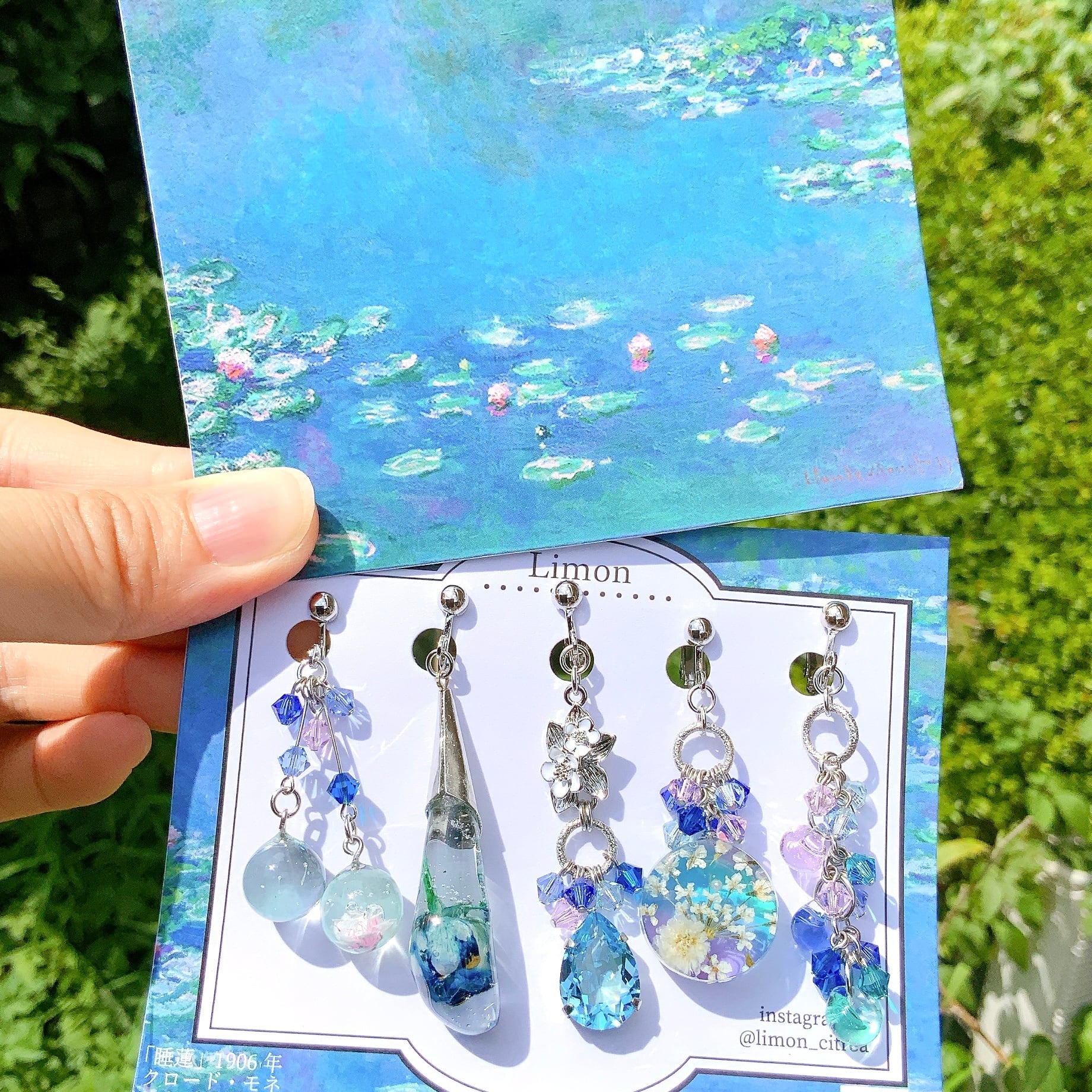 睡蓮の池の絵画をモチーフに花で描いたレジンパーツから制作。