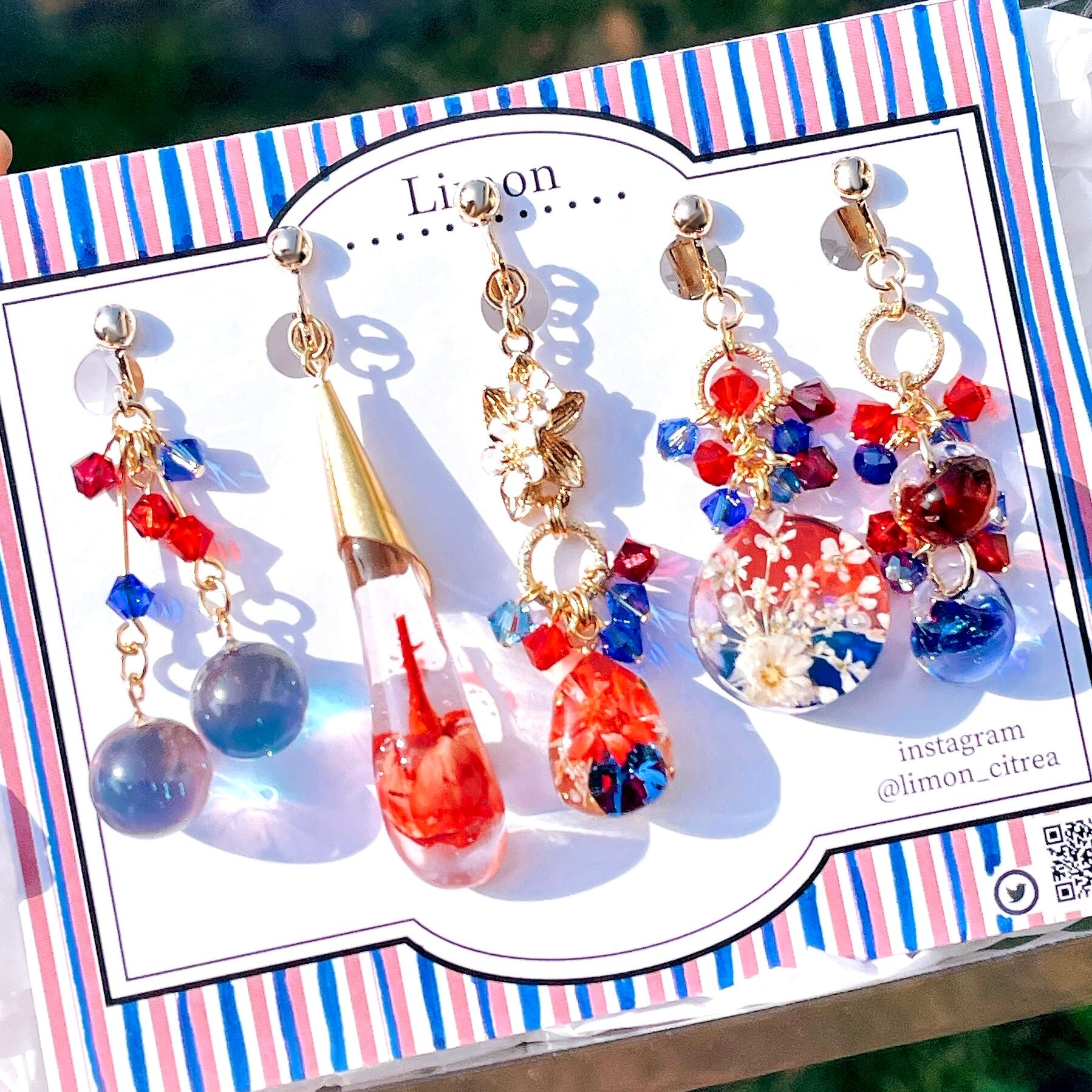 赤色の薔薇の一輪ブーケをメインにした耳飾り。