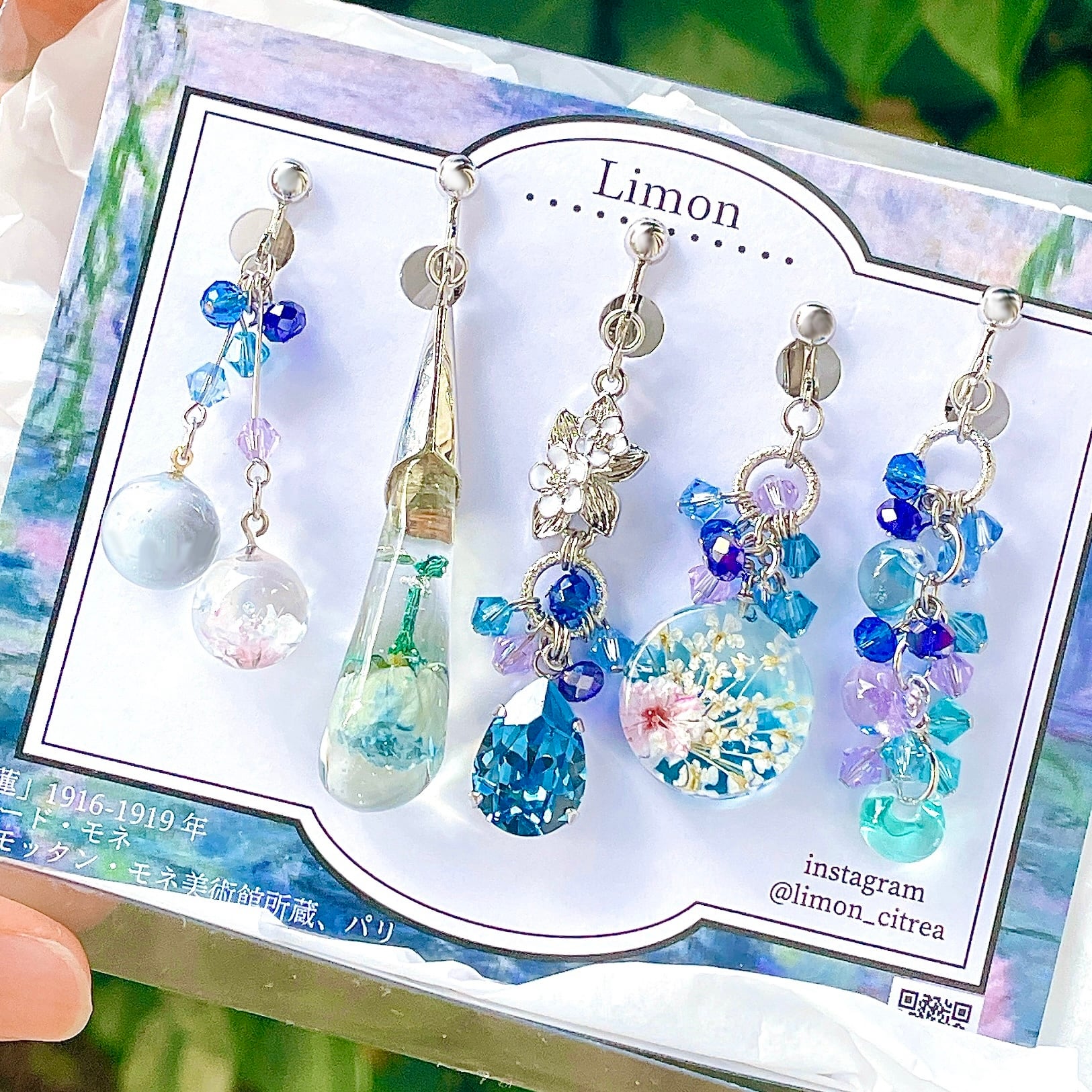 睡蓮の池の絵画をモチーフに花で描いたレジンパーツから制作。