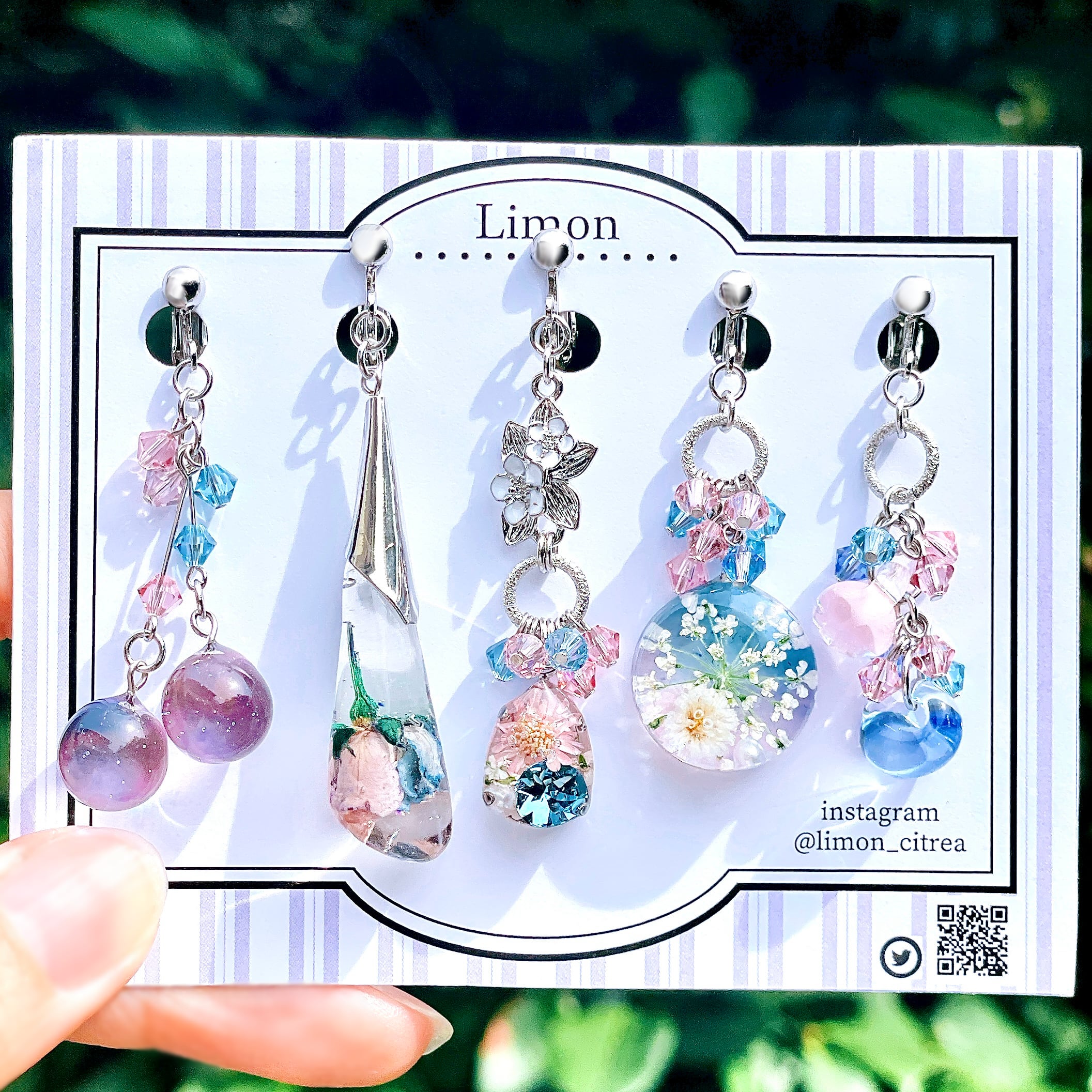 ピンクとブルーの薔薇の一輪ブーケをメインにした耳飾り。