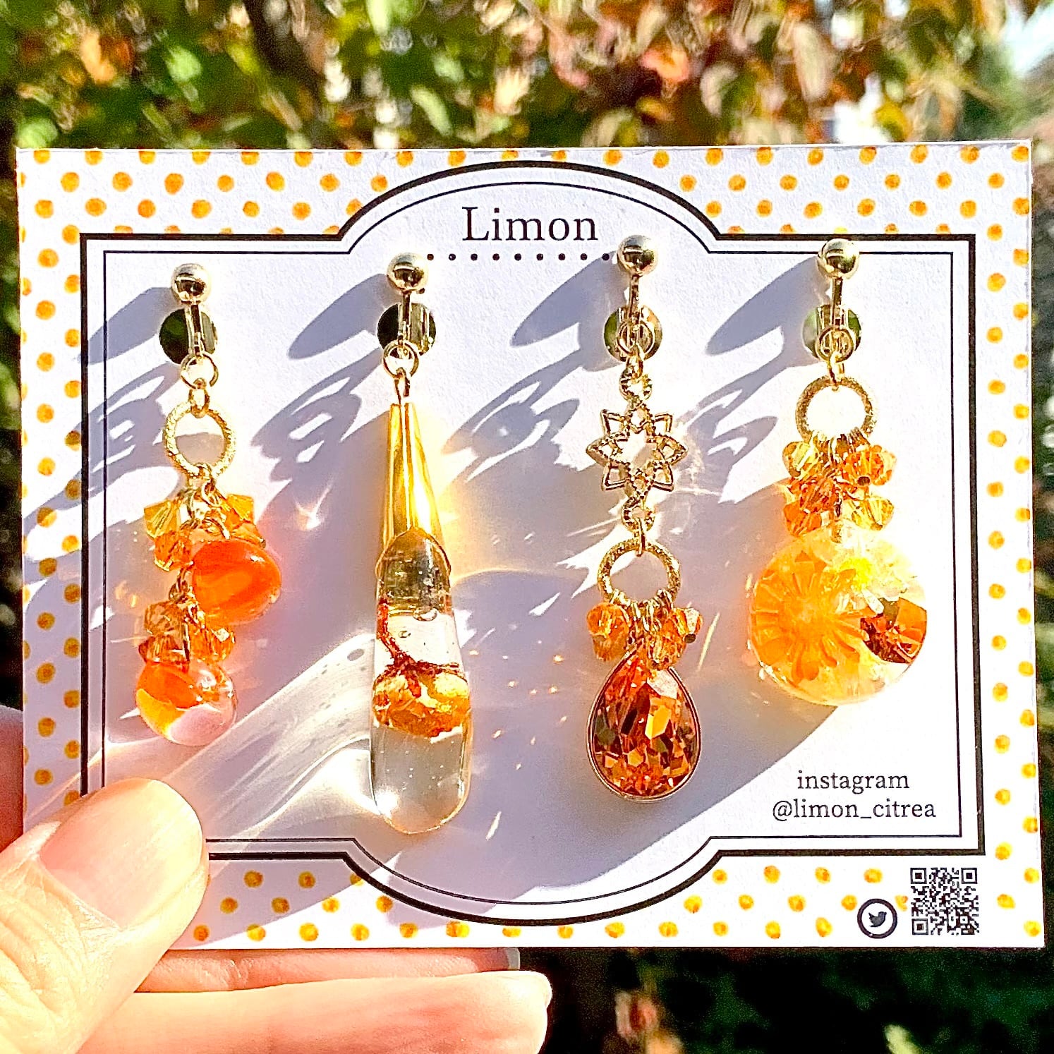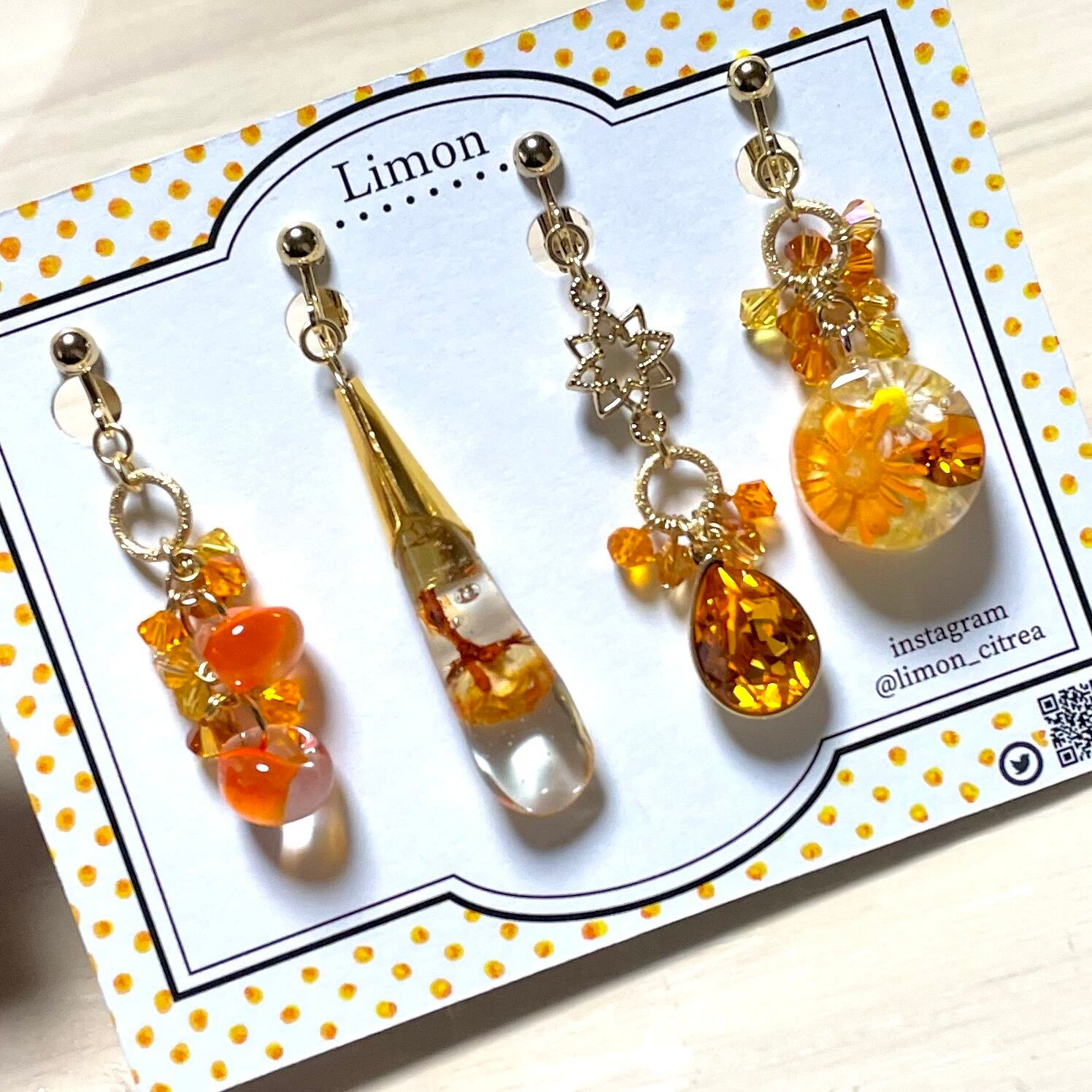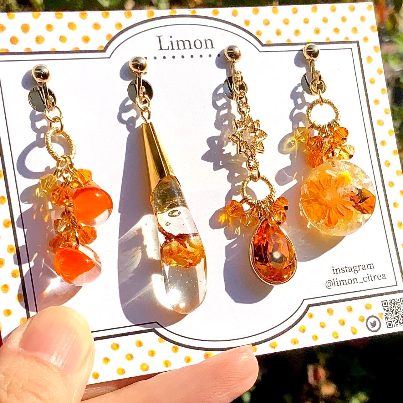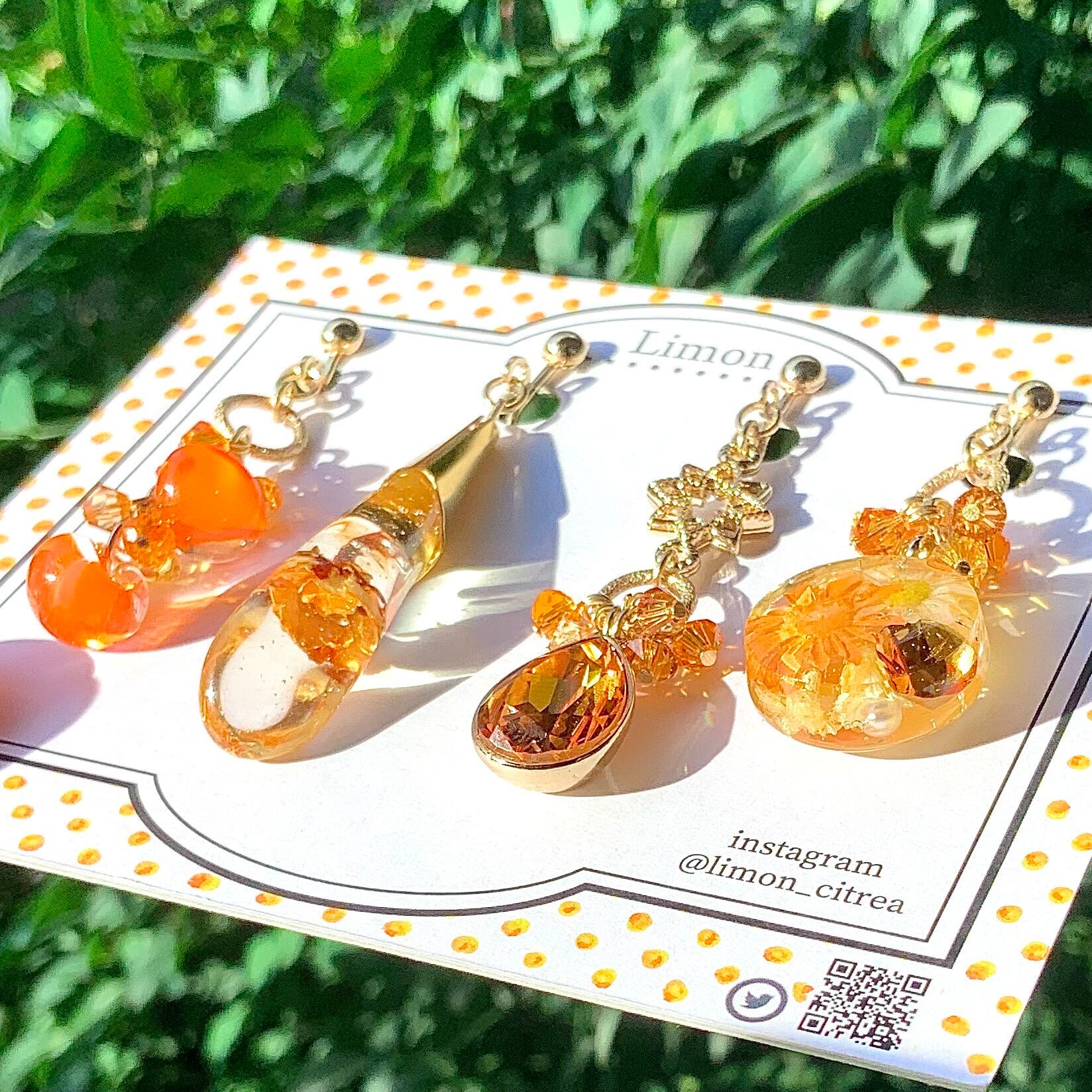 オレンジ色の薔薇の一輪ブーケをメインにした耳飾り。