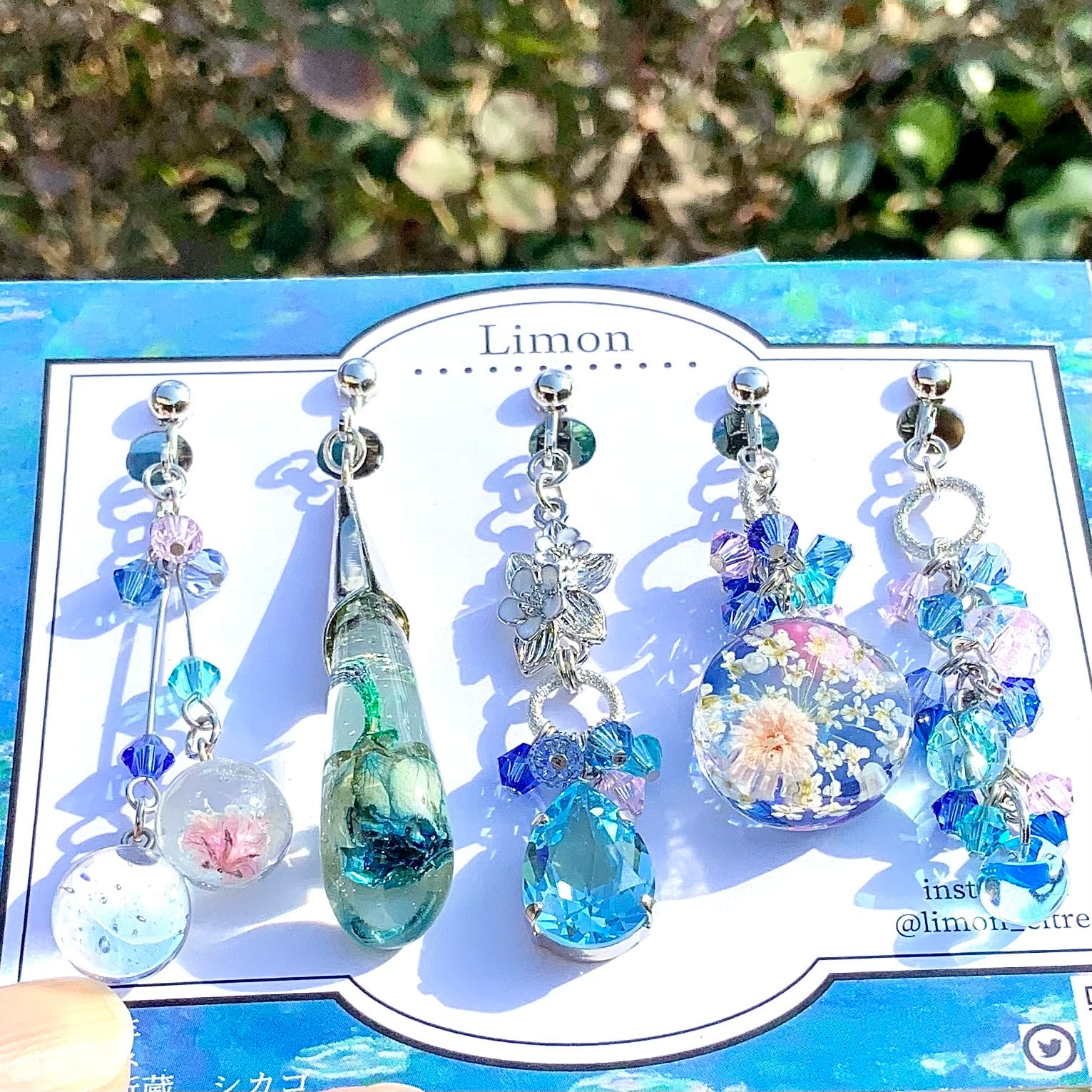 青色の薔薇の一輪ブーケをメインにした耳飾り。